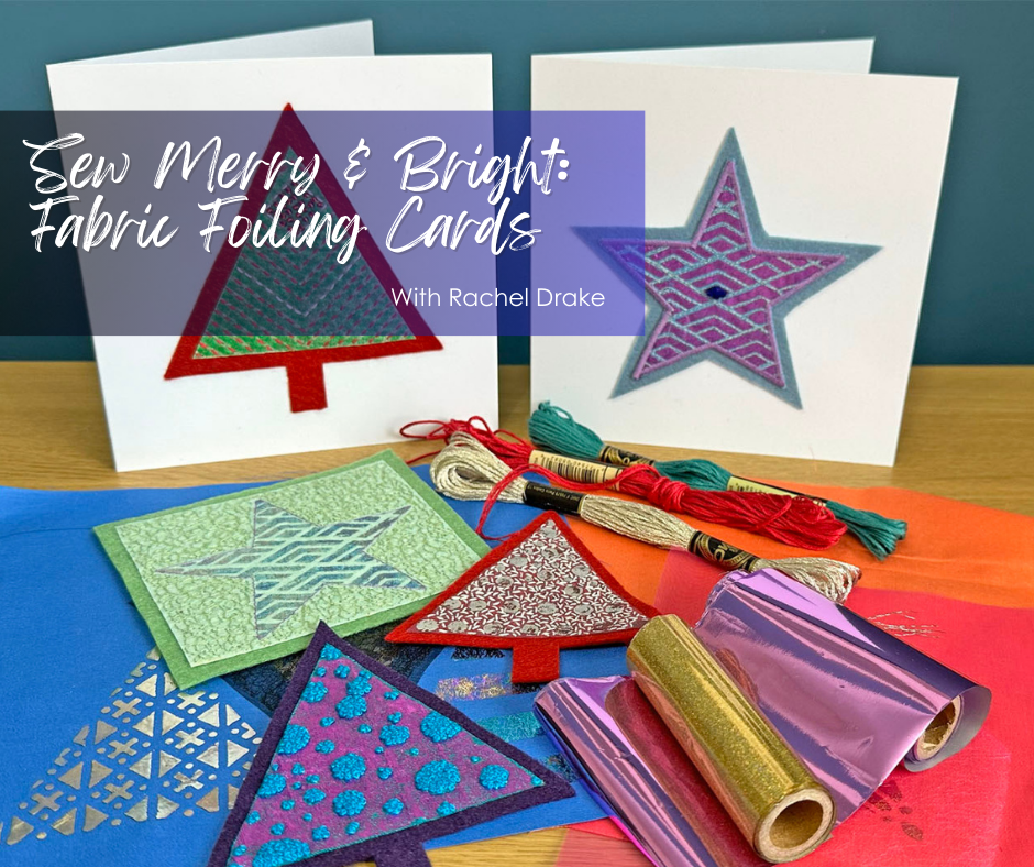 Create beautifully shimmery, stitched Christmas cards using textile foiling on fabric. Using simple foiling techniques, make festive stencils and add hand or machine embroidery for extra texture.