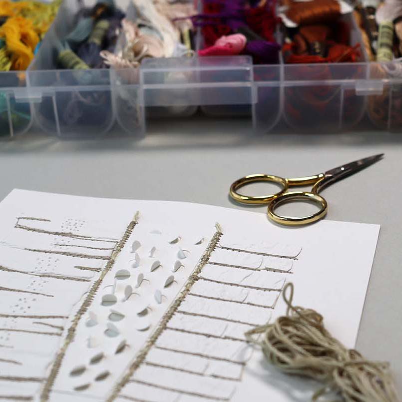 The course covers aspects of using hand and free machine embroidery working on paper collage.