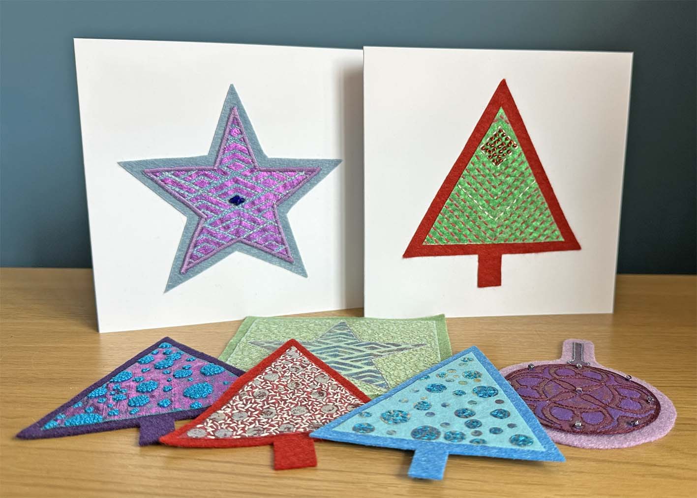 You’ll be guided through a set of approachable foiling techniques designed specifically for card-making on fabric. I’ll show you how to create your own adhesive stencils in classic Christmas shapes like stars and Christmas trees, so you can foil crisp, clean motifs even if you’re new to the process. Don’t have adhesive stencils? No problem. I also demonstrate an alternative method using bondaweb and MistyFuse, so you can create your own custom shapes.